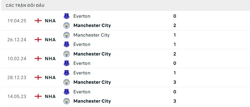Trong 5 lần gặp nhau gần nhất, Manchester City thắng 4 và hòa 1 trước Everton, ghi tổng cộng 10 bàn và chỉ để lọt lưới 2 lần. Ở mùa trước, họ hòa 1-1 tại Etihad vào tháng 12/2024, trận đấu mà Erling Haaland sút hỏng phạt đền trước Jordan Pickford.
