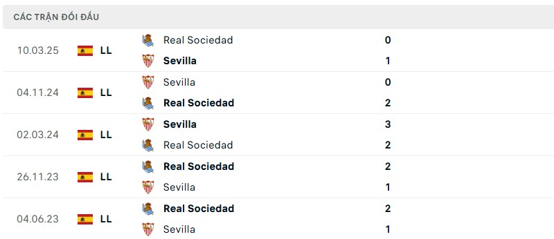 Trong lịch sử đối đầu, Real Sociedad và Sevilla là cặp đấu thường xuyên mang đến thế trận giằng co. Năm lần gặp nhau gần nhất, Sociedad nhỉnh hơn với ba chiến thắng, trong khi Sevilla thắng hai. Đáng chú ý, lần gần nhất hai đội hòa nhau đã từ tháng 3/2022 – điều cho thấy sự phân định thắng bại gần như luôn xuất hiện mỗi khi họ gặp nhau.
