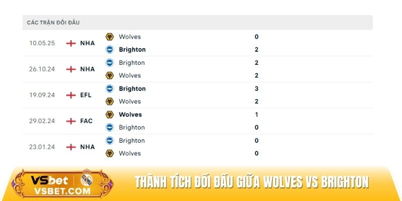 Mặc dù có điểm tựa sân nhà, tuy nhiên, đây cũng không phải lợi thế quá lớn với Wolves khi đối đầu với Brighton. Theo lịch thi đấu sau 5 lần gần nhất tiếp đón Chim Mòng Biển trước đó, họ chỉ giành được 1 chiến thắng và nhận tới 4 thất bại. Do vậy, khả năng cao Bầy Sói sẽ phải chấp nhận thêm một lần trắng tay.